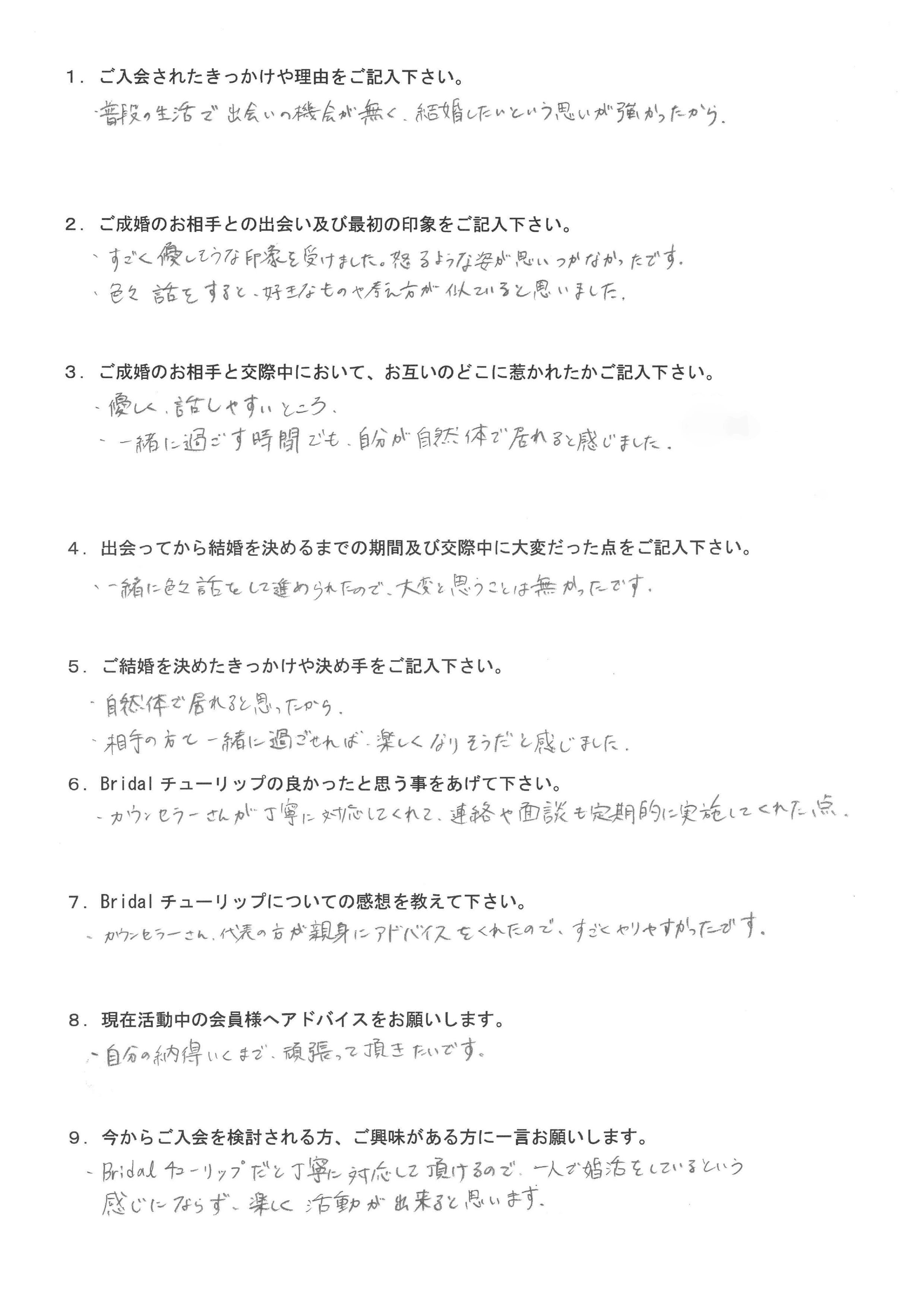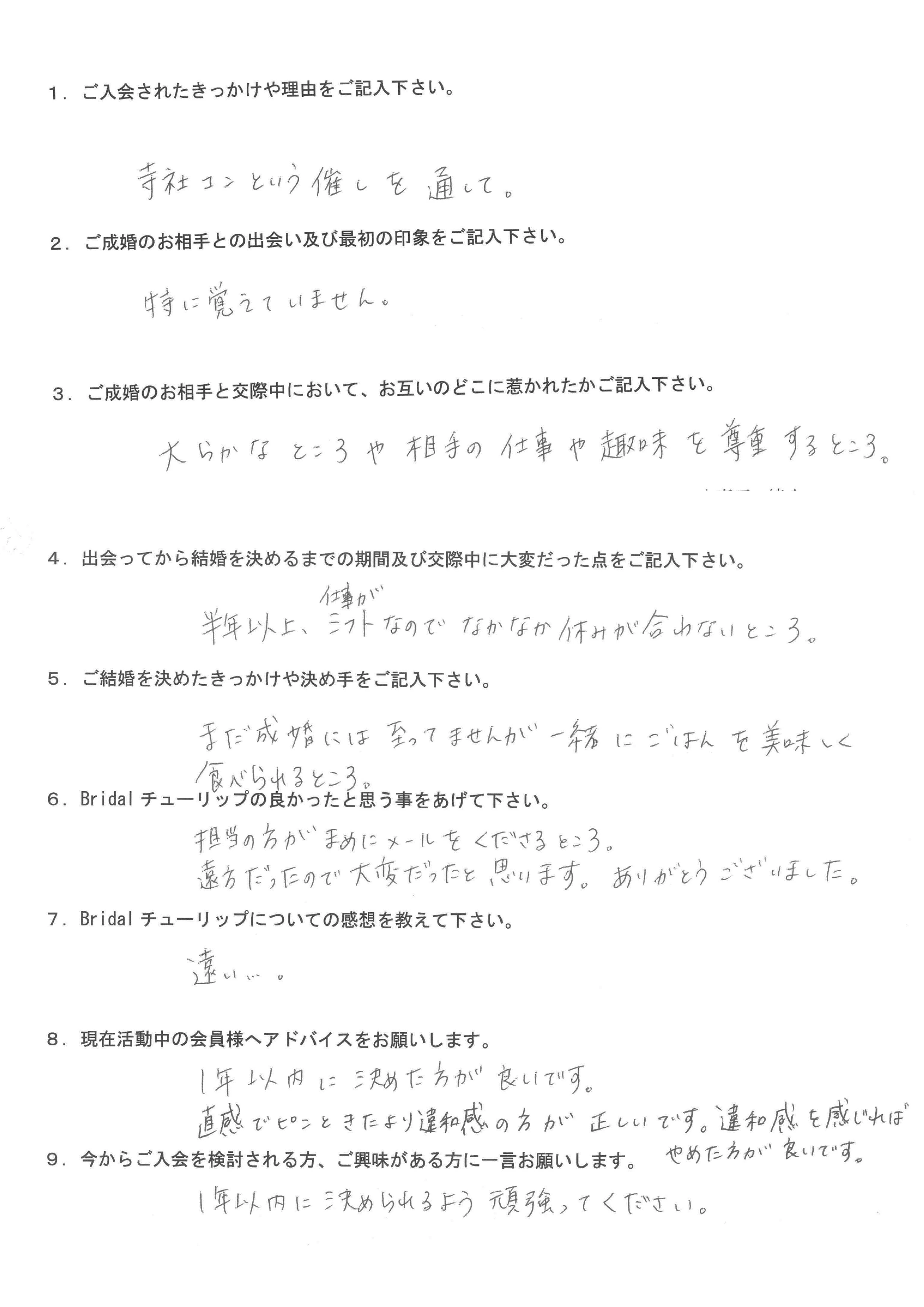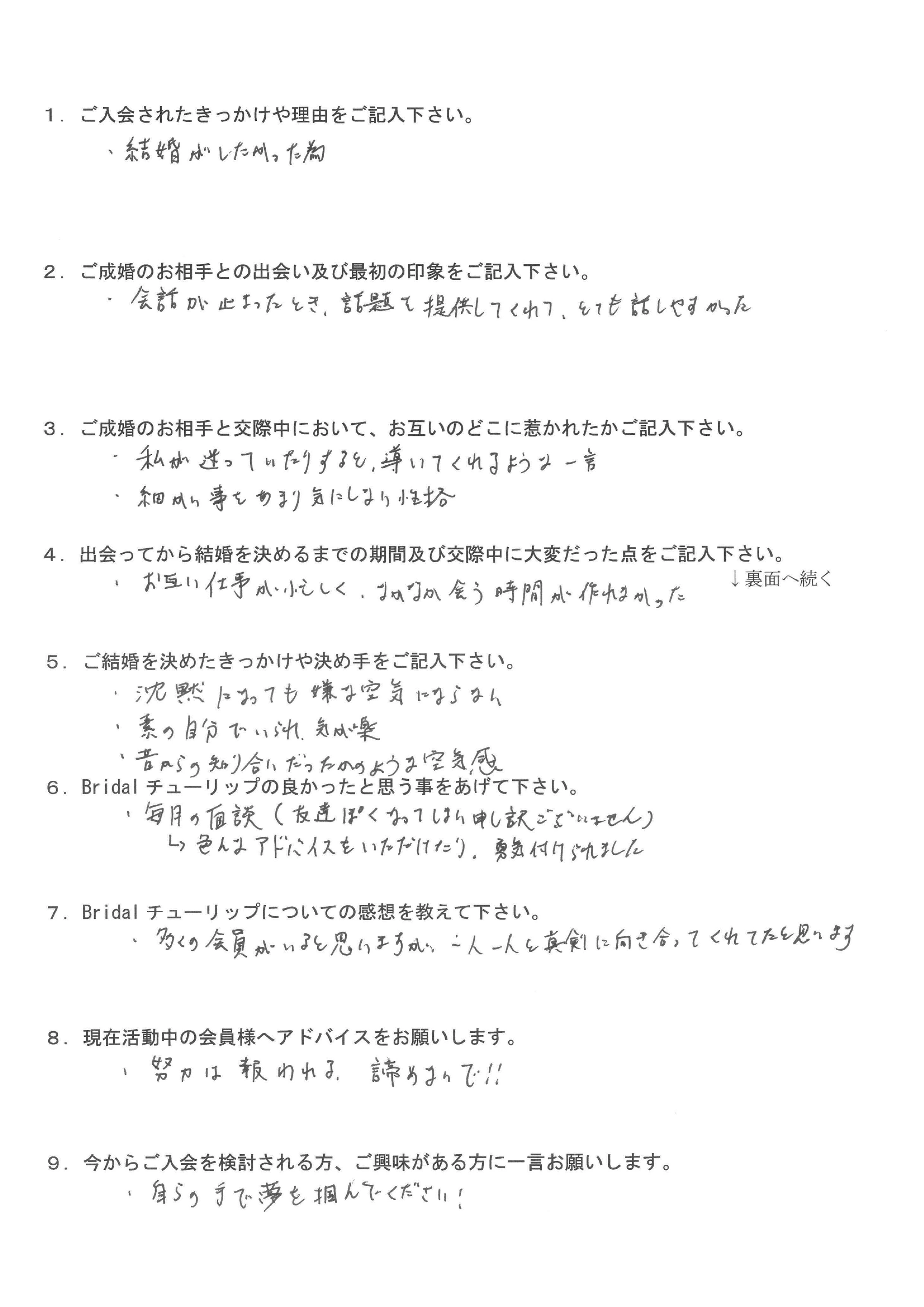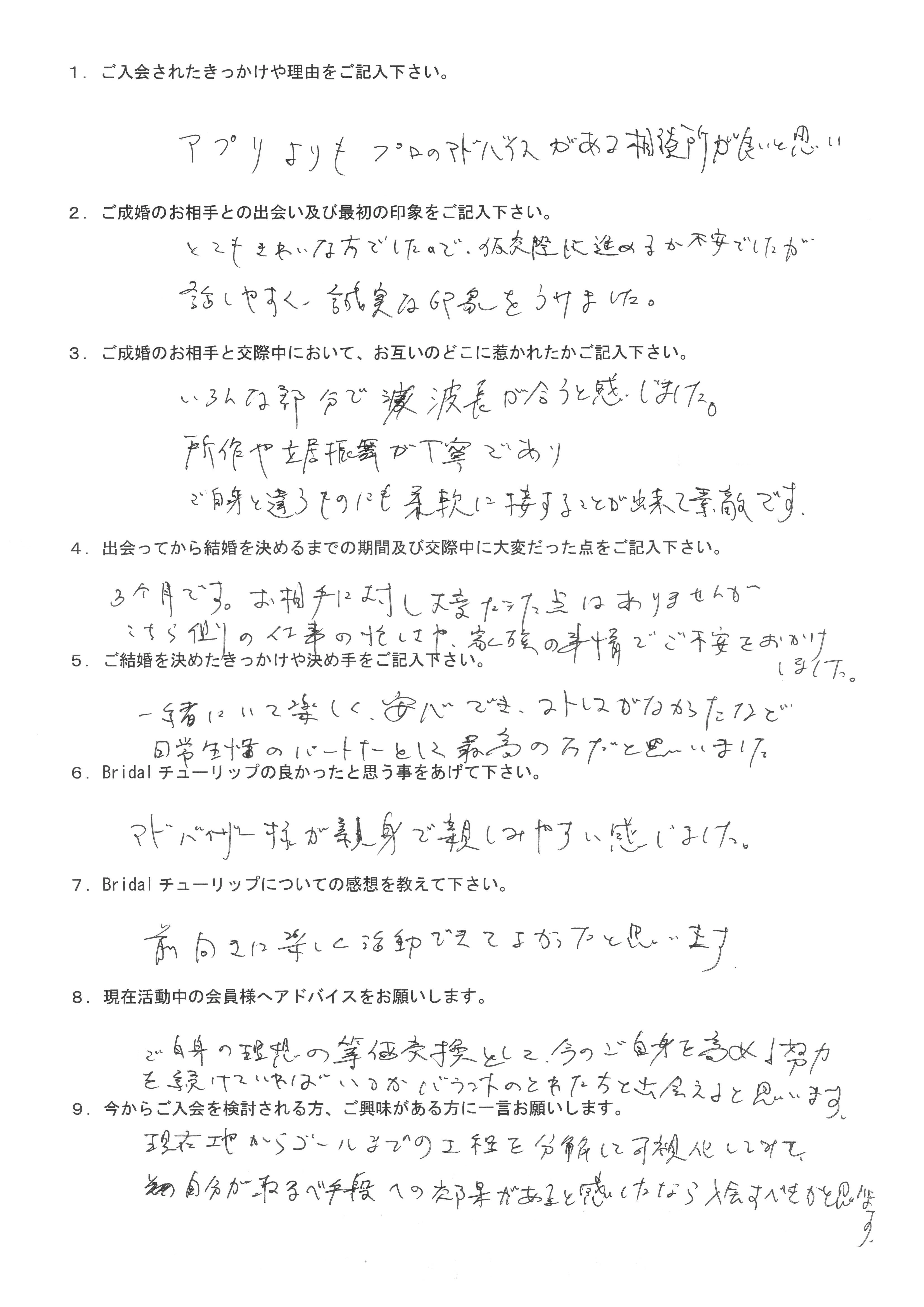 当社では、成婚者様の婚活体験を直筆のアンケートにご記入いただいています。