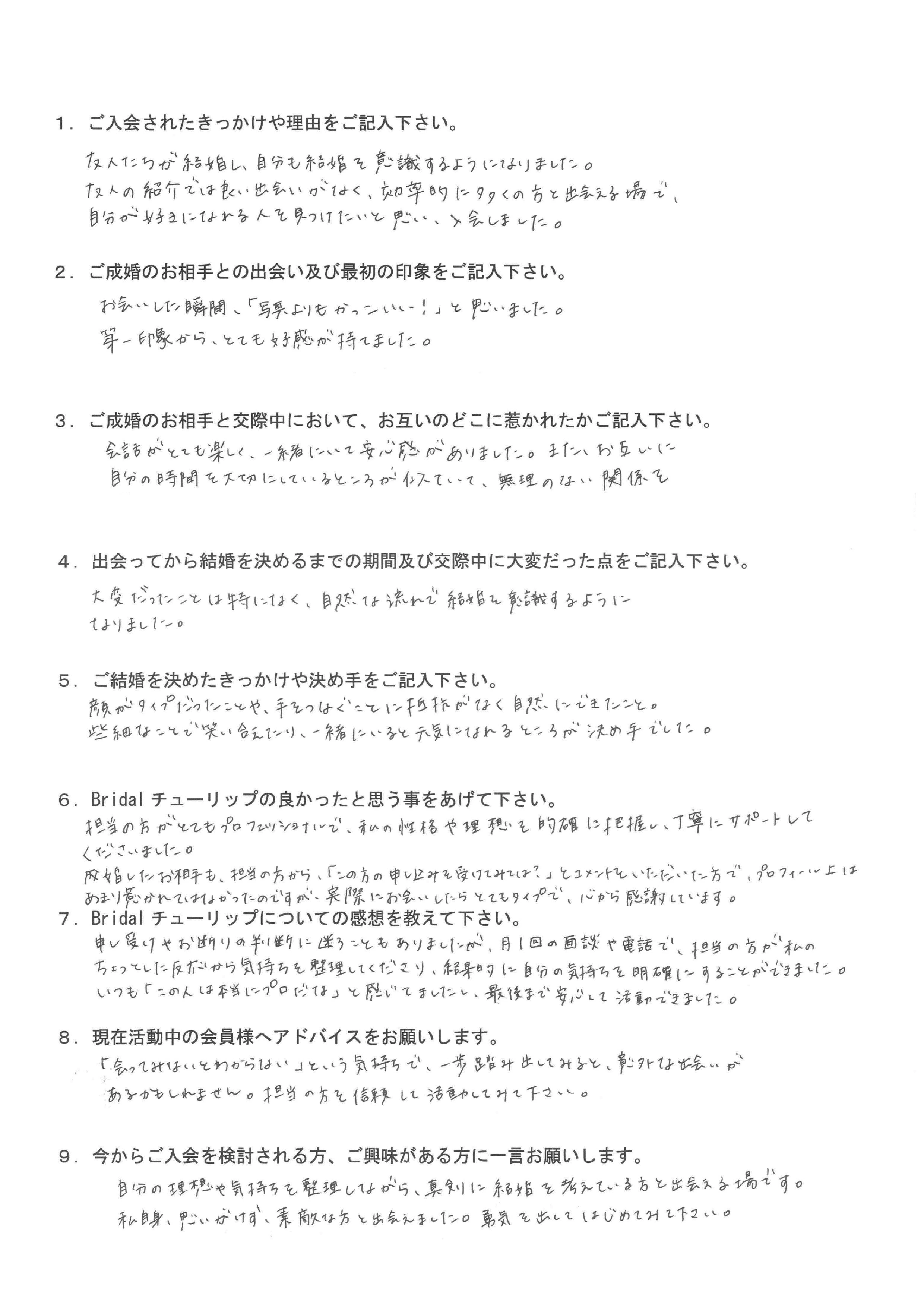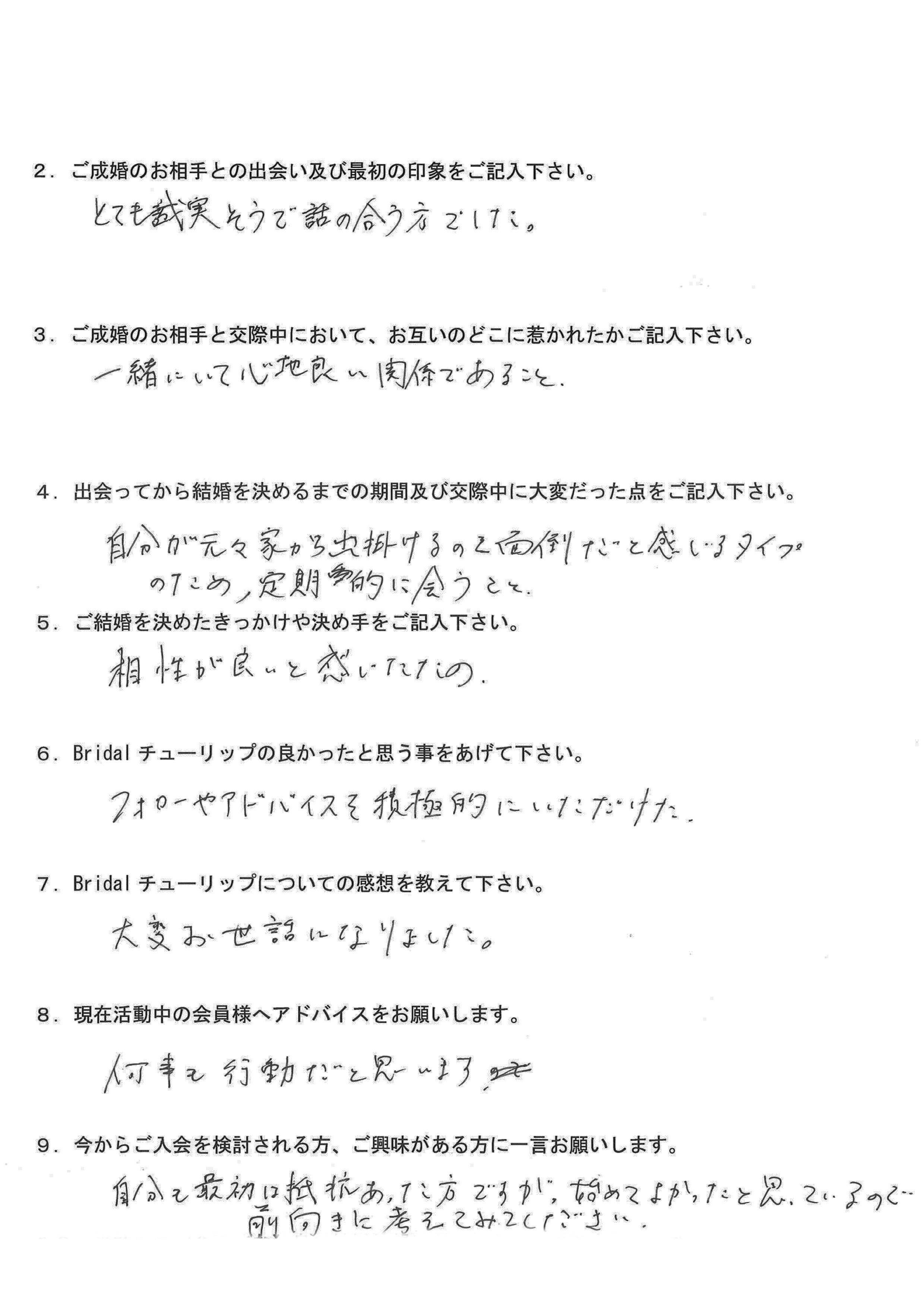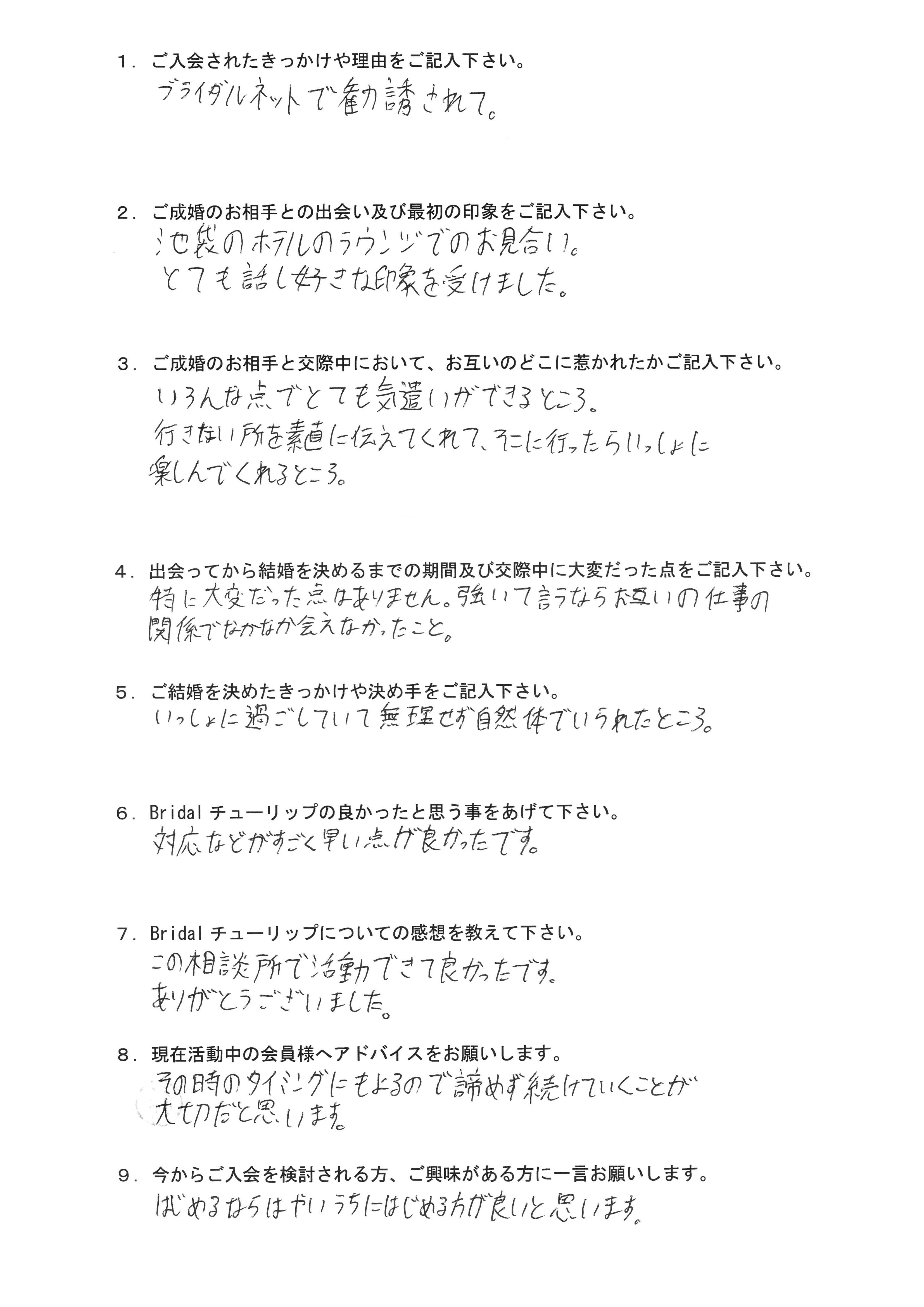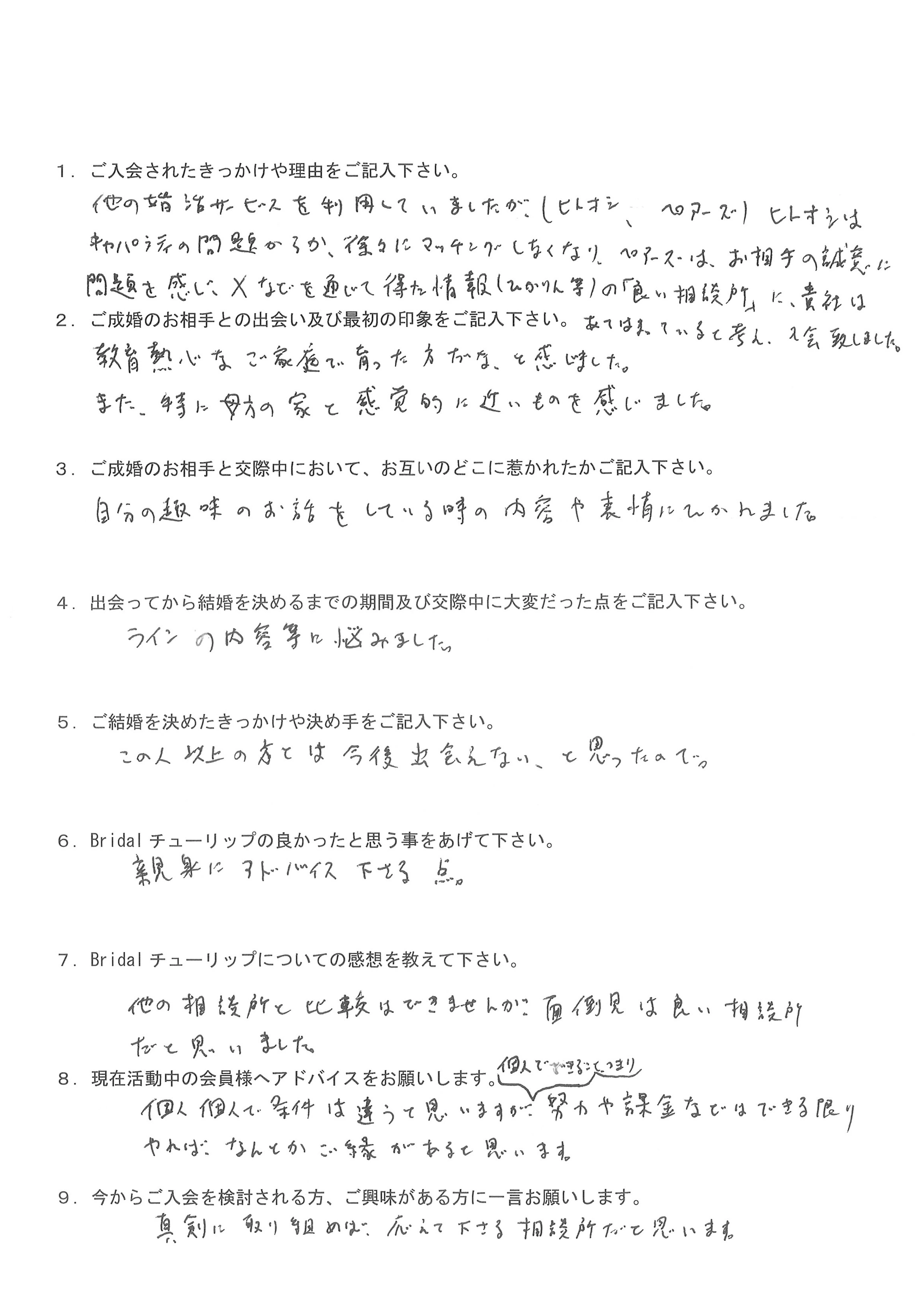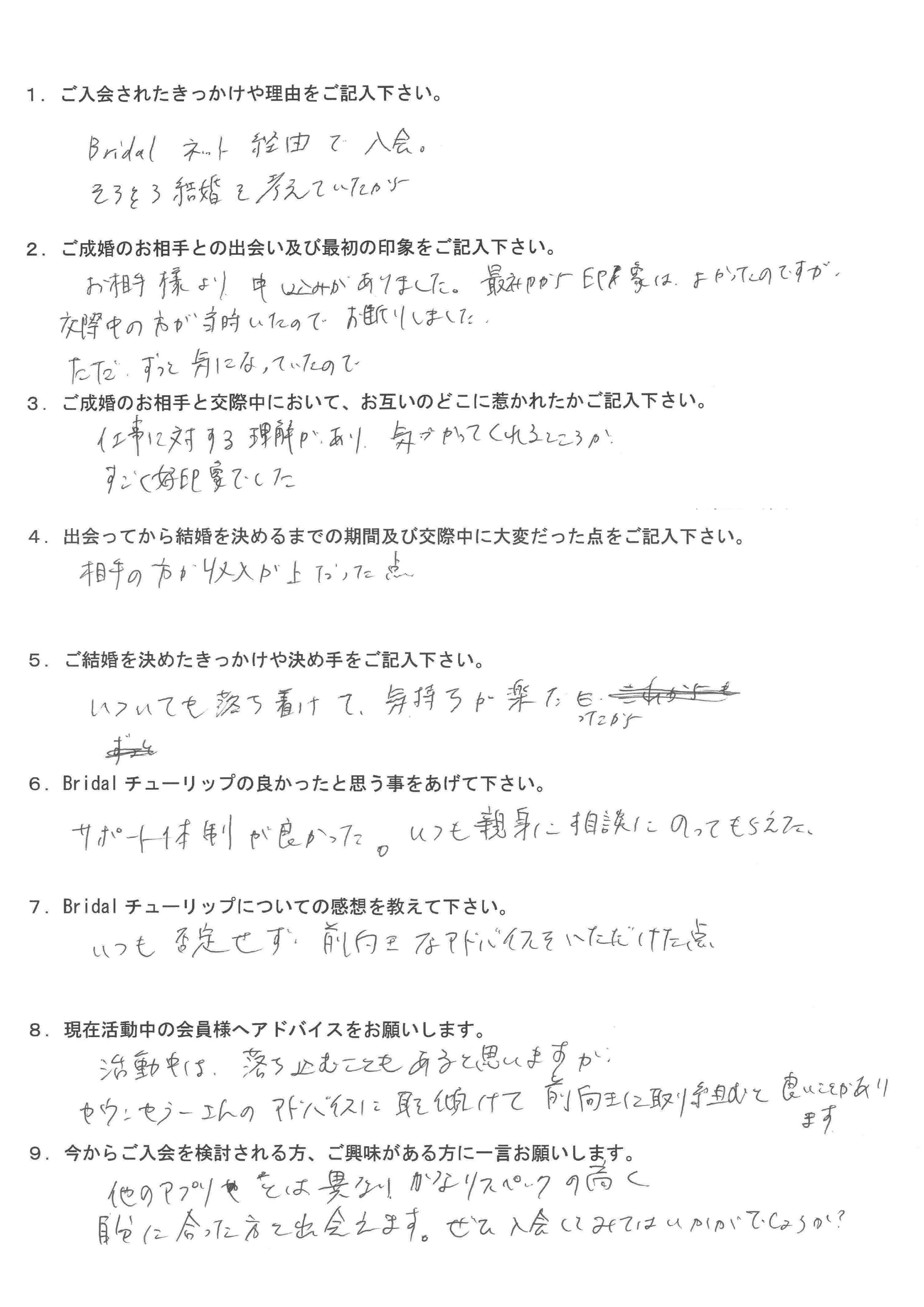 当社では、成婚者様の婚活体験を直筆のアンケートにご記入いただいています。